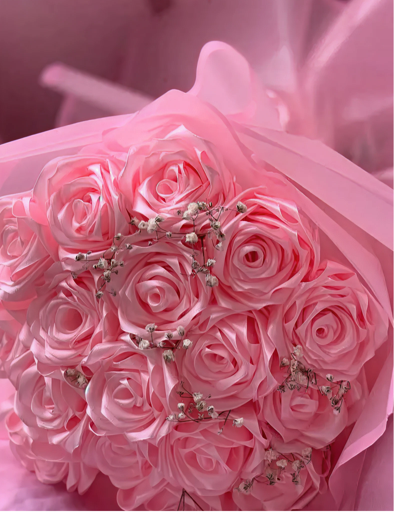 Artisanal “Floral Cake” Design: A unique, dome-shaped arrangement that mimics the look of a luxury celebration cake using premium satin-pink roses.