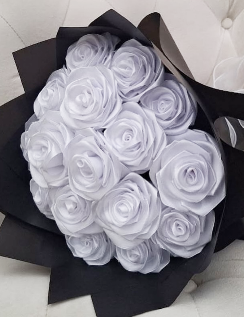 Visual Beauty and Texture The “Eternal Light” bouquet is a striking study in contrast and grace. At its heart is a lush collection of ivory-white roses, each petal meticulously folded to create a full, blooming appearance. The smooth, satin-like texture of the flowers catches the light with a soft, pearlescent sheen, suggesting a sense of calm and clarity. This luminous center is dramatically encased in heavy-weight, matte black wrapping paper, folded into sharp, modern pleats. The monochromatic palette ensures that the focus remains entirely on the purity of the white roses, creating a visual representation of light emerging from the darkness.