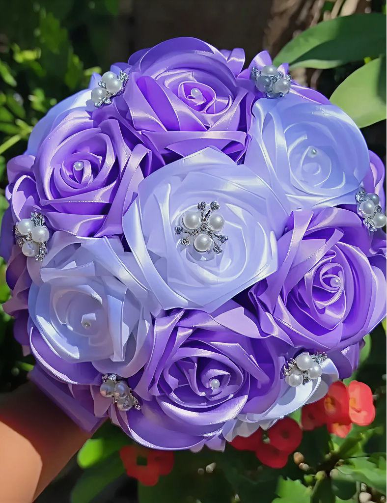 Emotion and Meaning Designed for the bride who wants to feel like royalty, this bouquet symbolizes enchantment, grace, and a love that is “rare and precious.” The purple tones are traditionally associated with nobility and magic, while the pearls represent purity and wisdom. By choosing a jeweled satin arrangement, you are opting for a piece of “everlasting jewelry” that won’t fade or wilt as the day progresses. It is a symbol of a timeless commitment, offering a sense of sophisticated wonder and calm confidence as you walk down the aisle toward your new beginning.