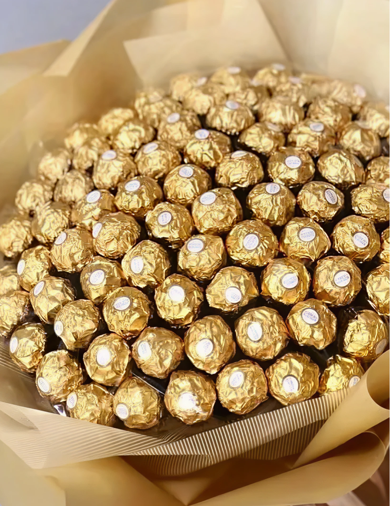 Indulge in the ultimate fusion of luxury and taste. The Golden Truffle Gala is designed for those who believe that a gift should be as delicious as it is beautiful. Moving beyond traditional petals, this show-stopping arrangement utilizes the rich, textured aesthetic of gourmet gold-wrapped hazelnut chocolates to create a dense, glittering dome of decadence. It is a bold statement piece that captures attention and satisfies the sweet tooth of your most cherished recipients.