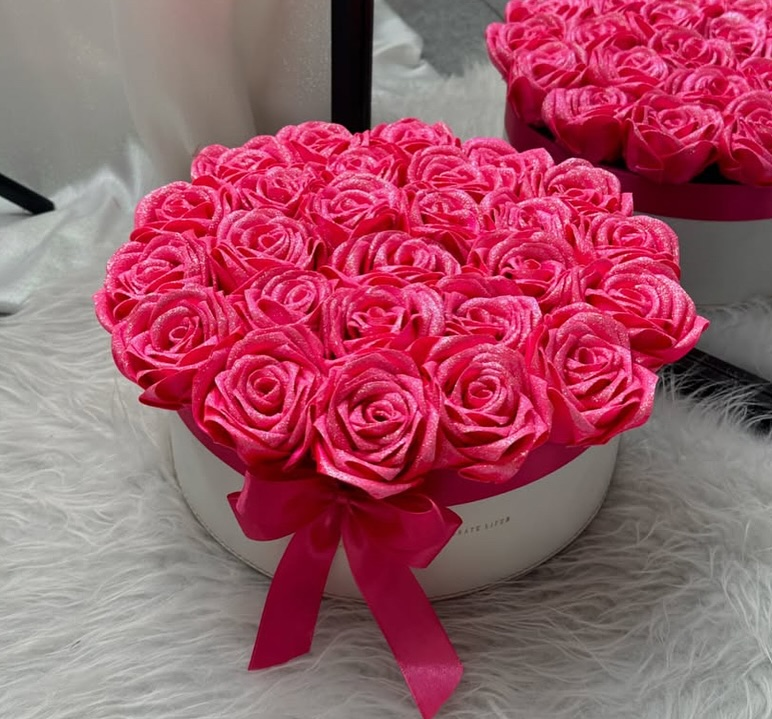 Dazzle and delight with a floral gift that radiates confidence. The Radiant Fuchsia Hatbox is designed for those who love bold colors and a touch of glamour. Featuring a dense arrangement of our signature satin roses, each petal is treated with a fine shimmer that transforms the bouquet into a glowing centerpiece. The intense pink hues evoke passion and joy, making it the perfect choice for high-energy celebrations, from milestone birthdays to romantic surprises.
