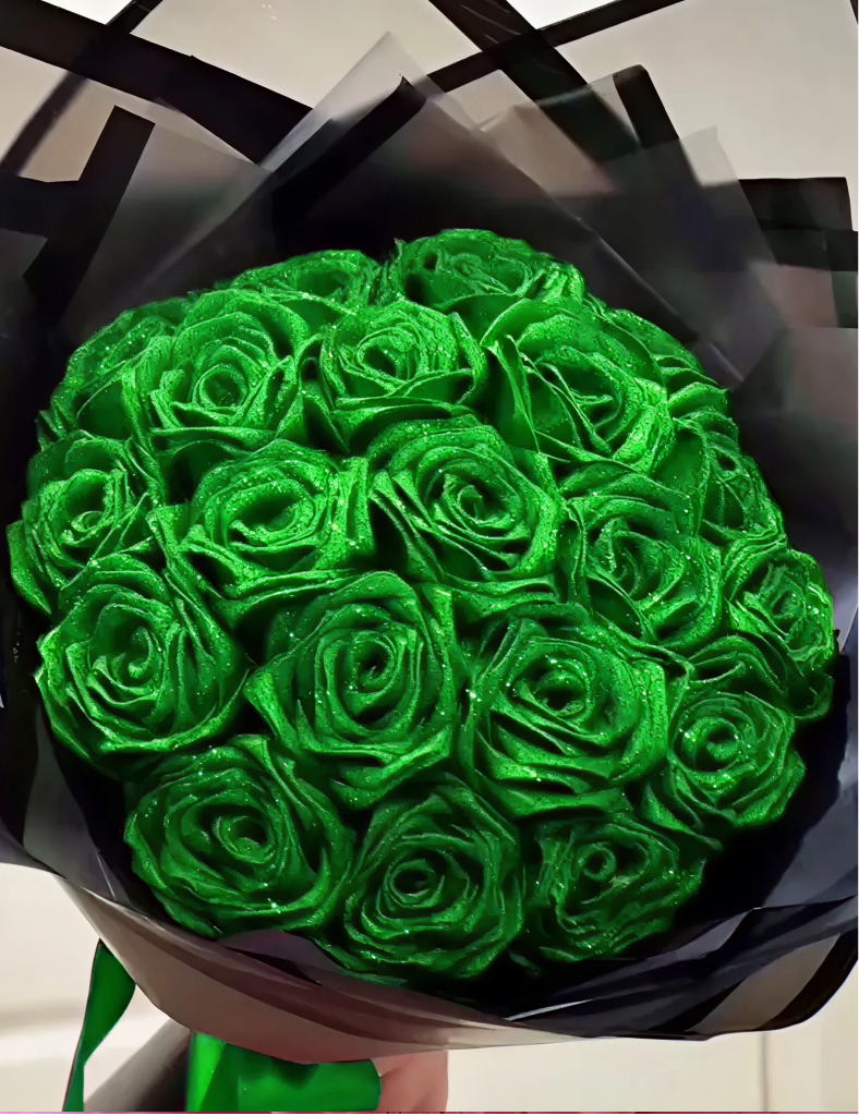 Unique Artistry: Features meticulously crafted, shimmering emerald green roses that offer a bold and rare aesthetic.