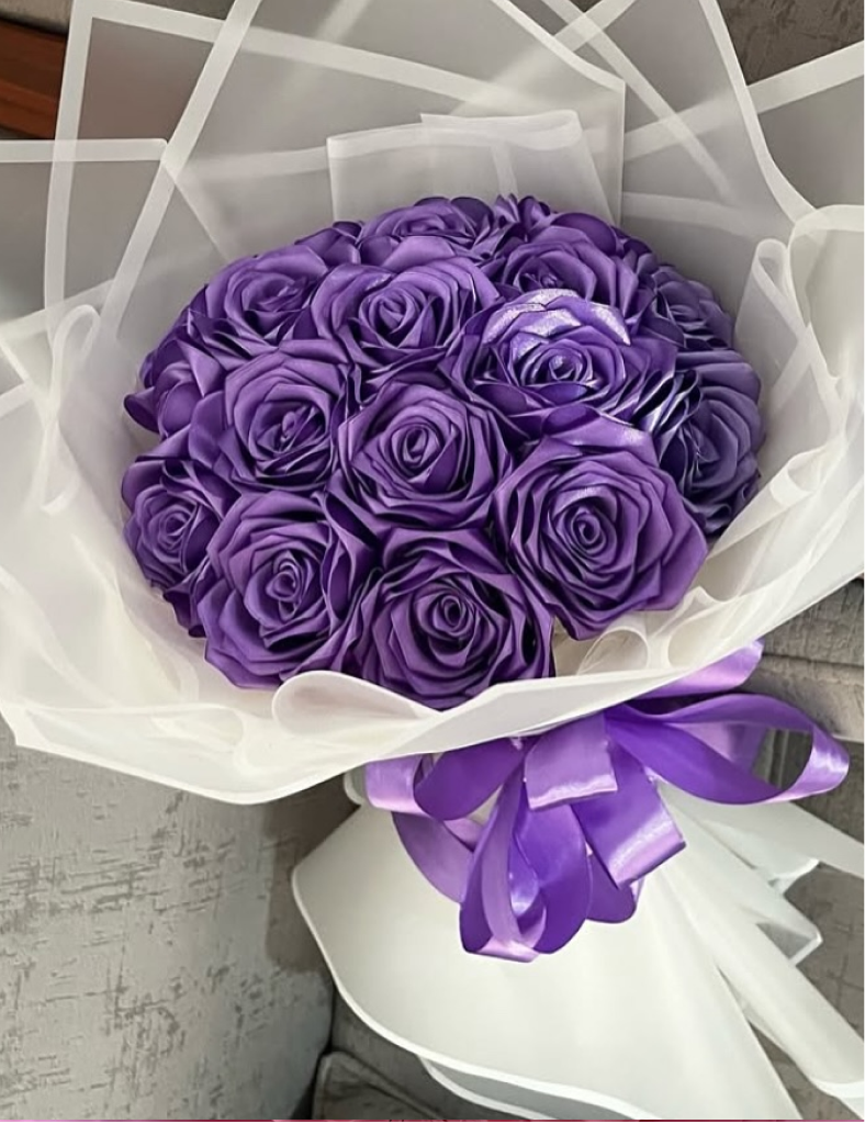 Experience the height of floral sophistication with a bouquet that commands attention. The Velvet Amethyst Hand-Tied Bouquet is a stunning addition to our Hand-Tied Classics collection, designed for those who appreciate the intersection of bold color and modern design. Each individual rose is carefully hand-folded from high-quality satin, ensuring a silky texture and a uniform, professional bloom that captures the light from every angle.