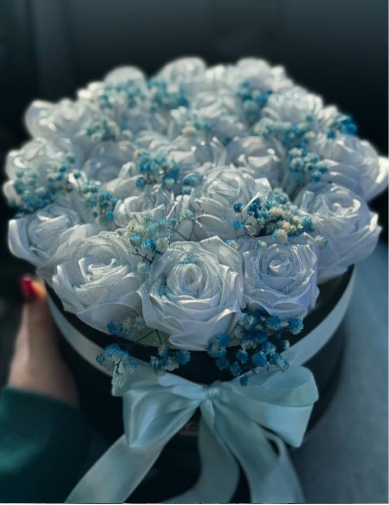 Visual Beauty and Texture The “Winter’s Breath” arrangement is a study in cool tones and soft textures. The bouquet is dominated by pristine white roses that have been meticulously arranged to create a full, domed silhouette. Nestled between these snowy blooms are clusters of tinted blue baby’s breath, providing a gentle splash of color that mimics a clear winter sky. The subtle glitter on the petals adds a dimensional sparkle, making the entire piece look as though it were freshly plucked from a frost-covered garden. The dark circular box provides a bold, modern base that allows the lightness of the flowers to truly pop.